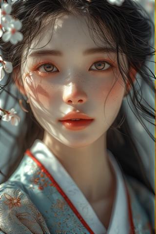 - "Portrait of a young Asian woman with long flowing hair, wearing traditional hanbok, serene expression, cherry blossoms in the background, soft natural lighting, photorealistic style inspired by Alphonse Mucha, intricate details on fabric, close-up shot (eyes:1.3) --ar 1:1 --no distortions, no blurry face"