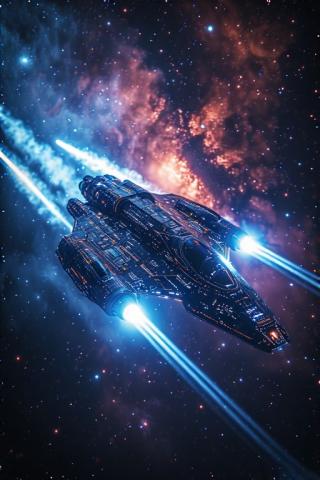 - "Sleek interstellar spaceship blasting through a nebula, engines glowing blue, stars and colorful gas clouds in space, dynamic motion blur, in the cyberpunk style of Syd Mead, ultra-high resolution, dramatic volumetric lighting --v 5 --no debris, no planets"