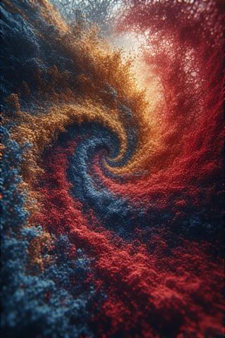 "Abstract swirling vortex of crimson red, gold, and indigo blues, evoking chaos and energy, fractal patterns emerging, digital art in the style of Jackson Pollock meets Mandelbrot sets, high contrast, 4K resolution --stylize 750 --no figures, no text"