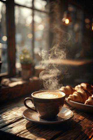 "Steaming cup of black coffee on a wooden table beside fresh croissants, morning sunlight filtering through a window, cozy cafe vibe, hyper-realistic photography style, sharp focus on steam and textures, bokeh background --ar 4:3 --no logos, no people"