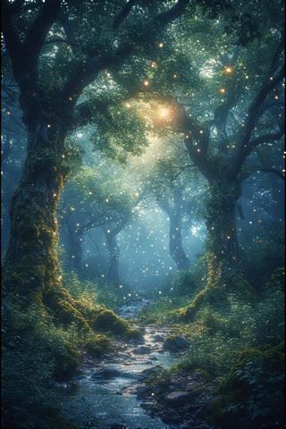 - "Ancient enchanted forest with towering oak trees covered in moss, a gentle stream winding through, fireflies glowing in the twilight, mystical fog rolling in, in the style of Studio Ghibli animation, highly detailed, vibrant greens and blues, 16:9 aspect ratio --no humans, no modern elements"