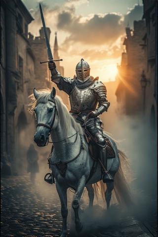 "Medieval knight in ornate silver armor riding a white stallion through a misty castle courtyard, sword raised triumphantly, dramatic sunrise casting golden rays, epic fantasy illustration by Frank Frazetta, detailed textures on metal and fur, wide-angle view --q 2 --no anachronisms, no cartoonish elements"